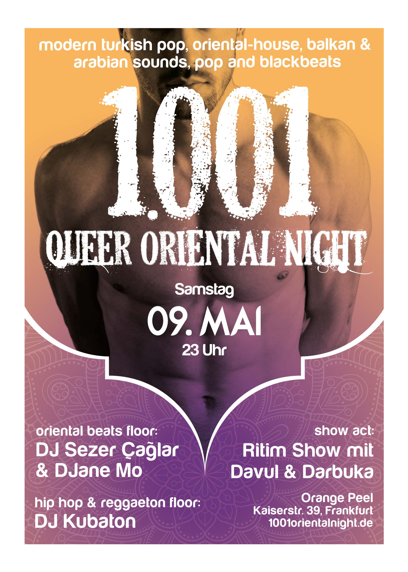 Nächster Termin der 1001 Queer Oriental Night ist Samstag, 9. Mai 2026 ab 23 Uhr auf 2 Floors im Orange Peel Frankfurt.